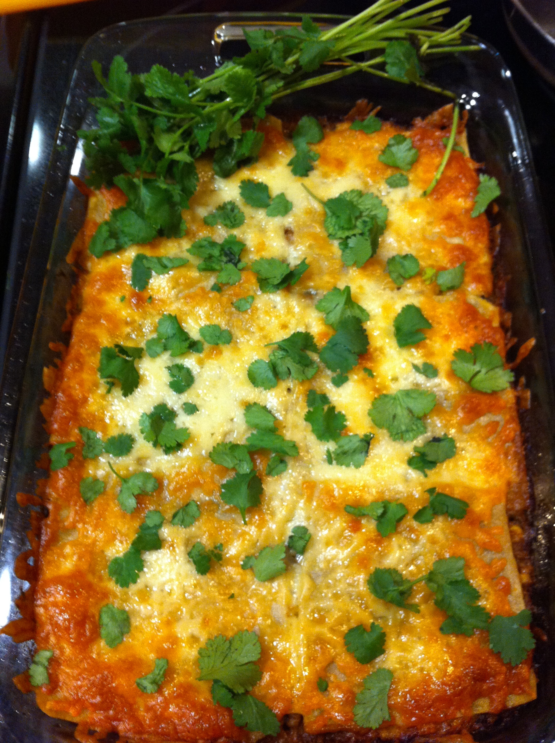 Mex lasagne in dish w cilantro